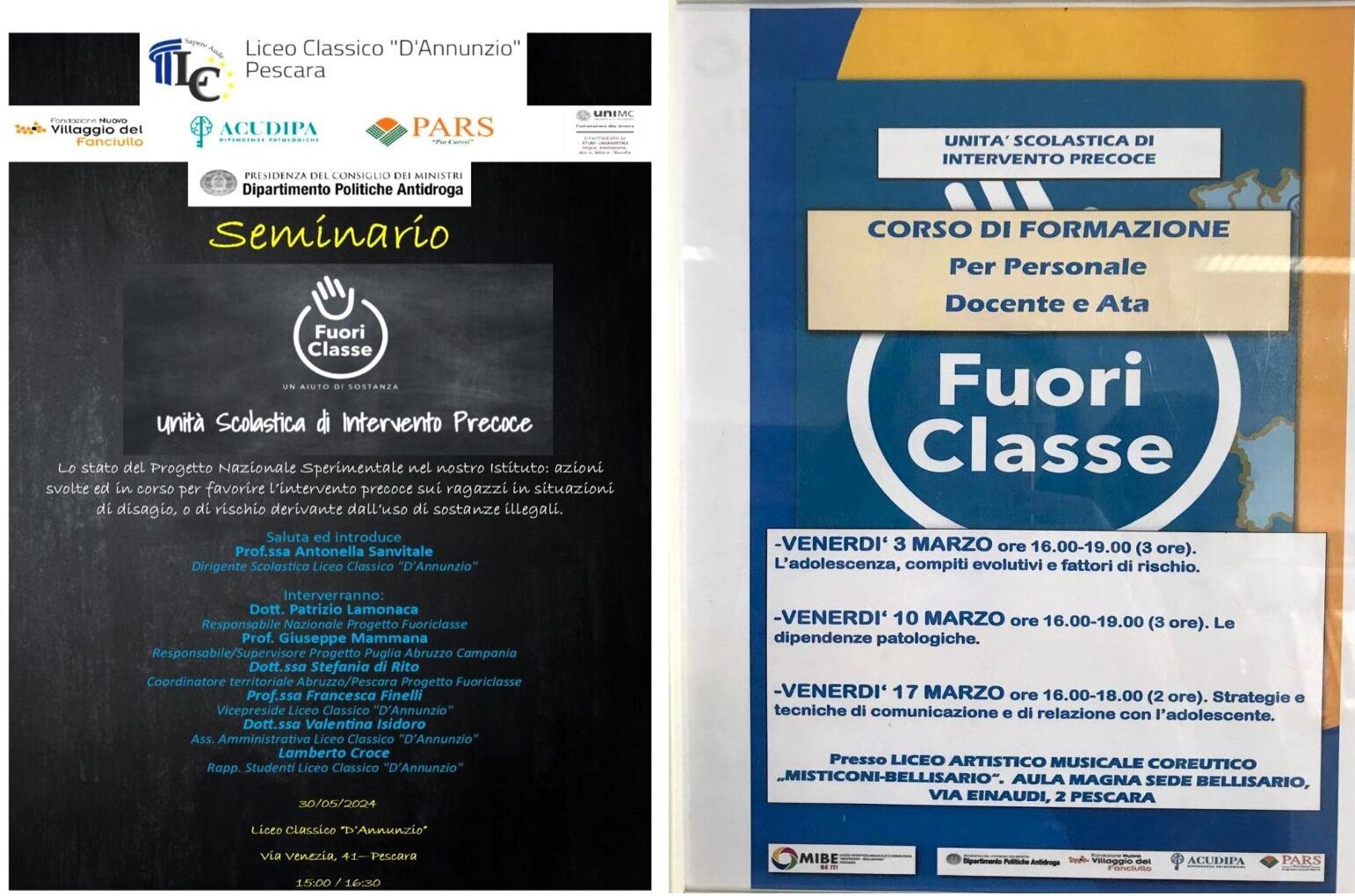 In Abruzzo il progetto Fuori Classe: Unità Scolastica d’Intervento Precoce è stato attuato in quattro scuole secondarie di secondo grado, più un evento di disseminazione dei risultati ottenuti svoltosi a Pescara. A conclusione del progetto, tutti i coordinatori, referenti territoriali e key expert che hanno erogato la formazione hanno infatti creato un protocollo condiviso per la gestione dei casi a rischio presentati all’interno di ogni scuola coinvolta. Il protocollo in questione, denominato “I 7 passi per la prevenzione all’utilizzo di sostanze nella scuola”, si articola appunto in 7 fasi che possono essere modulate e applicate in tutte le scuole italiane. Responsabile del progetto per la regione Abruzzo, il dottor Giuseppe Mammana, psichiatra e presidente dell’Associazione A.Cu.Di.Pa., Foggia. Gli incontri formativi sono stati svolti dalla dottoressa Stefania Di Rito, psicologa e psicoterapeuta, coordinatrice territoriale del progetto.