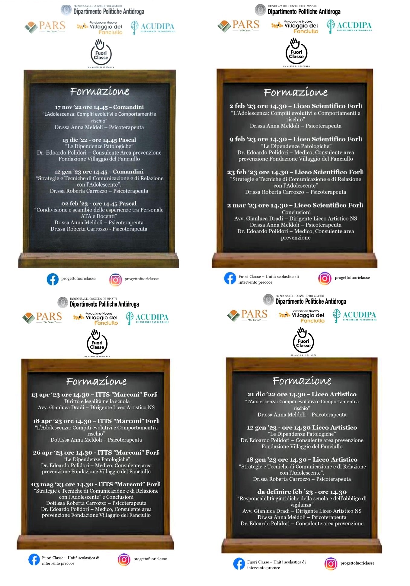 Quattro le scuole secondarie di secondo grado della regione Emilia Romagna coinvolte nel progetto Fuori Classe: Unità Scolastica di Intervento Precoce, incentrato su cicli di incontri formativi utili a fornire conoscenze e linee guida per prevenire, rilevare e gestire eventuali situazioni di uso di sostanze stupefacenti da parte degli adolescenti. Il progetto si rivolge in particolar modo ai collaboratori scolastici, figure chiave nell’individuazione dei potenziali comportamenti a rischio tra i ragazzi, che generalmente avvengono “fuori classe”, appunto. Responsabile del progetto per la regione Emilia Romagna, il dottor Patrizio Lamonaca, direttore generale della Fondazione Nuovo Villaggio del Fanciullo, Ravenna, capofila del progetto. Gli incontri formativi sono stati svolti da: dottoressa Anna Meldoli, psicologa e psicoterapeuta; dottor Edoardo Polidori, consulente Area Prevenzione Fondazione Nuovo Villaggio del Fanciullo; dottoressa Roberta Carrozzo, psicologa e psicoterapeuta; avvocato Gianluca Dradi, dirigente scolastico Liceo Artistico Nervi-Severini, Ravenna.