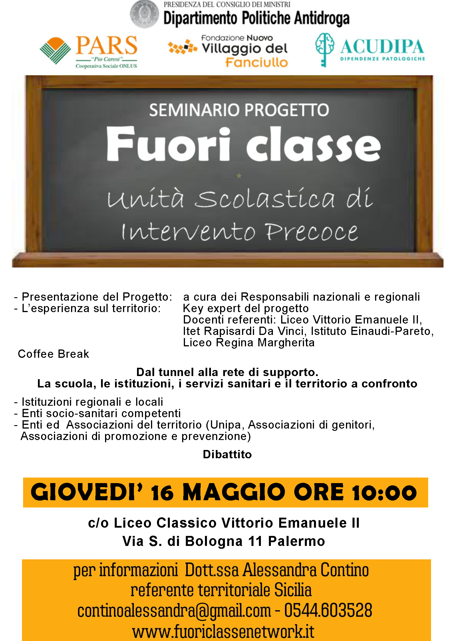 In Sicilia sono stati quattro gli istituti scolastici secondari di secondo grado coinvolti nel progetto Fuori Classe: Unità Scolastica di Intervento Precoce, più un seminario con dibattito sul tema della prevenzione delle dipendenze tra i giovani e la rete di intervento attiva in caso di comportamenti a rischio, svoltosi a Palermo. E’ importante sottolineare come le scuole approcciate abbiano espresso il bisogno di svolgere delle attività di prevenzione integrata rivolte anche a studenti e genitori, perciò, a partire da maggio 2023, sono stati organizzati interventi mirati che hanno coinvolto anche i ragazzi con le loro famiglie. Responsabile del progetto per la regione Sicilia, il dottor Patrizio Lamonaca, direttore generale della Fondazione Nuovo Villaggio del Fanciullo, Ravenna, capofila del progetto. Gli incontri formativi sono stati svolti dalla dottoressa Alessandra Contino, sociologa e coordinatrice territoriale del progetto.